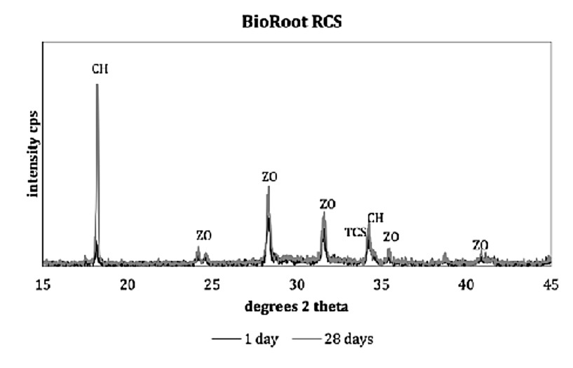 Hidratarea BioRoot™ RCS care arată fazele cristaline formate după 1 și 28 de zile de la amestecare folosind difractometrie cu raze X