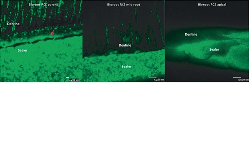 S-a raportat că la contactul materialelor pe bază de silicat tricalcic cu dentina și fluidele tisulare se depun fosfați pe suprafața materialelor. Acest lucru a fost descris pe larg pentru MTA (18-20). Interacțiunea dintre dentină și Biodentine™ a fost, de asemenea, bine documentată. O legătură chimică se realizează printr-o zonă de infiltrare minerală la interfața materialului cu dinte (21). Această proprietate este importantă pentru sigilanți, deoarece adeziunea sigilantului la dentina canalului radicular va duce la mai puține microinfiltrări. Zona de infiltrare a mineralelor a fost raportată pentru BioRoot™ RCS utilizând microscopie confocală (22). Zona de infiltrare a mineralelor și pătrunderea sigilantului în tubulii dentinari asigură adaptarea sigilantului și adeziunea acestuia la dentina canalului radicular (Figura 4). Zona bogată în minerale a fost mai evidentă în porțiunea coronară decât în mijlocul rădăcinii și în apical. Acest lucru ar putea fi cauzat de acțiunea limitată a irigării cu acid etilen diaminotetracetic (EDTA) și de îndepărtarea stratului de frotiu în zona apicală a canalul radicular (23). Infiltrarea fosforului în BioRoot™ RCS atunci când acest sigilant este în contact cu dentina nu a fost dovedită. Analiza fazei de suprafață utilizând difractometria cu raze X nu a găsit formarea de fosfat de calciu în materialul în contact cu dentina. Acest lucru a fost demonstrat utilizând un model in vitro-in vivo în care a fost utilizată o coloană de joasă presiune umplută cu soluție fiziologică pentru a evalua priza materialului și compoziția chimică atunci când este utilizat. Această testare este mai fiabilă decât testarea in vitro în care se utilizează volume mari de lichid, ceea ce nu este o situație relevantă din punct de vedere clinic (14). Pentru a îmbunătăți adeziunea sigilantului la peretele canalului radicular, a fost sugerat un pansament salin tamponat cu fosfat pentru canalul radicular (23). Acest lucru ar duce la disponibilitatea ionilor de fosfat, sporind astfel legătura la interfață. Depunerea de fosfat de calciu a fost implicată în creșterea rezistenței la adeziune a sigilanților de canal pe bază de silicat tricalcic (24). În comparație cu MTA Fillapex și AH Plus, BioRoot™ RCS a arătat cea mai mare activitate antimicrobiană. Sigilanții de canal radicular au exercitat o activitate antimicrobiană mai mare atunci când EDTA a fost folosit ca irigant final. Din păcate, proprietățile antimicrobiene ale BioRoot™ RCS și ale altor sigilanți, inclusiv AH Plus, au arătat o reducere a proprietăților antimicrobiene atunci când soluția salină tamponată cu fosfat a fost utilizată ca irigant final în timpul tratamentului de canal (25).