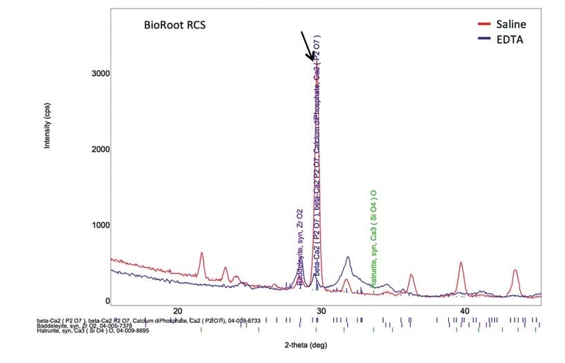 BioRoot™ RCS a fost afectat de protocolul de irigare utilizat. Utilizarea EDTA ca irigant final a dus la reducerea capacității de eliberare a calciului la jumătate (31). În plus, în contact cu dentina, faza de fosfat de calciu nu s-a format atunci când EDTA a fost utilizat ca irigant final (31), așa cum se arată în Figura 5, care a comparat fazele cristaline formate după utilizarea serului fiziologic sau EDTA ca soluție de irigare finală înainte de obturarea cu BioRoot™ RCS . Irigarea cu EDTA a arătat cele mai înalte proprietăți antimicrobiene pentru BioRoot™ RCS. Activitatea antimicrobiană a BioRoot™ RCS a fost semnificativ mai mare decât cea a MTA Fillapex și AH Plus. BioRoot™ RCS a prezentat cea mai mare activitate antimicrobiană și aceasta a fost îmbunătățită prin utilizarea soluției de irigare cu EDTA (25). Utilizarea soluțiilor de irigare bogate în fosfați este contraindicată cu BioRoot™ RCS și cu toți sigilanții pe bază de silicat tricalcic. Aplicarea căldurii în timpul compactării verticale la cald afectează fluiditatea și grosimea peliculei BioRoot™ RCS. Astfel, acest sigilant este recomandat pentru a fi folosit cu tehnica monocon sau condensare laterală (16). Alegerea sigilantului trebuie luată în considerare atunci când se selectează tehnica de obturare.