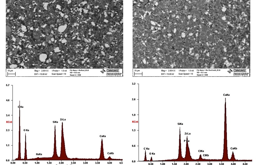 A avut potențialul de a fi utilizat ca ciment de sigilare a canalelor radiculare în practica clinică (11). BioRoot™ RCS este prezentat într-un format de pulbere și lichid, așa cum se arată în Figura 1. Pulberea este compusă din silicat tricalcic ca material de ciment activ și oxidul de zirconiu ca radiopacifiant (12). Lichidul este compus din apă, clorură de calciu, povidonă și un polimer solubil în apă. Microstructura sigilantului și analiza elementară sunt prezentate în Figura 2 (A, C), iar hidratarea acestuia pe o perioadă de 28 de zile cu formarea hidroxidului de calciu este prezentată în Figura 3.